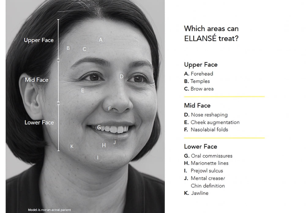 Ellanse can be used to treat any area that exhibits the sign of aging but it is primarily used on the face. Common areas are temples and brow, cheeks, nose, nasolabial folds, jawline, chin, and marionette lines. Other areas of treatment include hands and neck. Expected results include wrinkles reduction, added volume and contour to cheeks, chin, and lower jaw, filling under-eye hollows (tear trough), nose to mouth lines, lifted drooping mouth corners, rejuvenated the skin on the neck, cleavage, and hands, and softened appearance of acne scars.