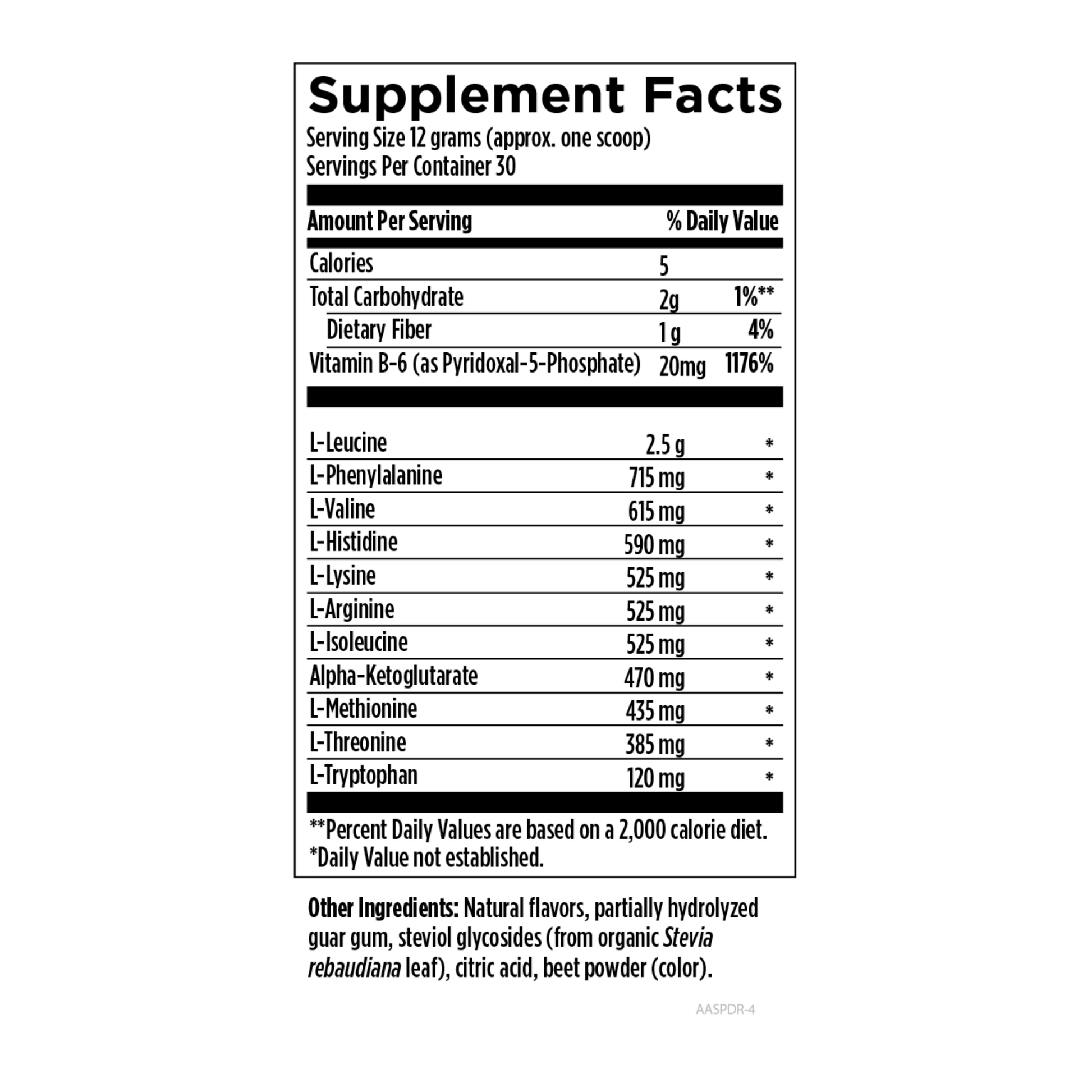 This potent formula supports muscle health and protein balance with L-leucine and a balanced mix of free-form essential amino acids. Ideal for adults seeking to maintain lean body mass or mitigate age-related muscle loss. Its fruit punch-flavored, non-GMO powder is gluten, dairy, and soy free with zero sugar. Mix 12 g (approximately one scoop) in 8-10 oz of water daily, or as directed by a healthcare practitioner, to promote muscle synthesis and overall protein status. Consult a physician if you have phenylketonuria or other medical conditions.
