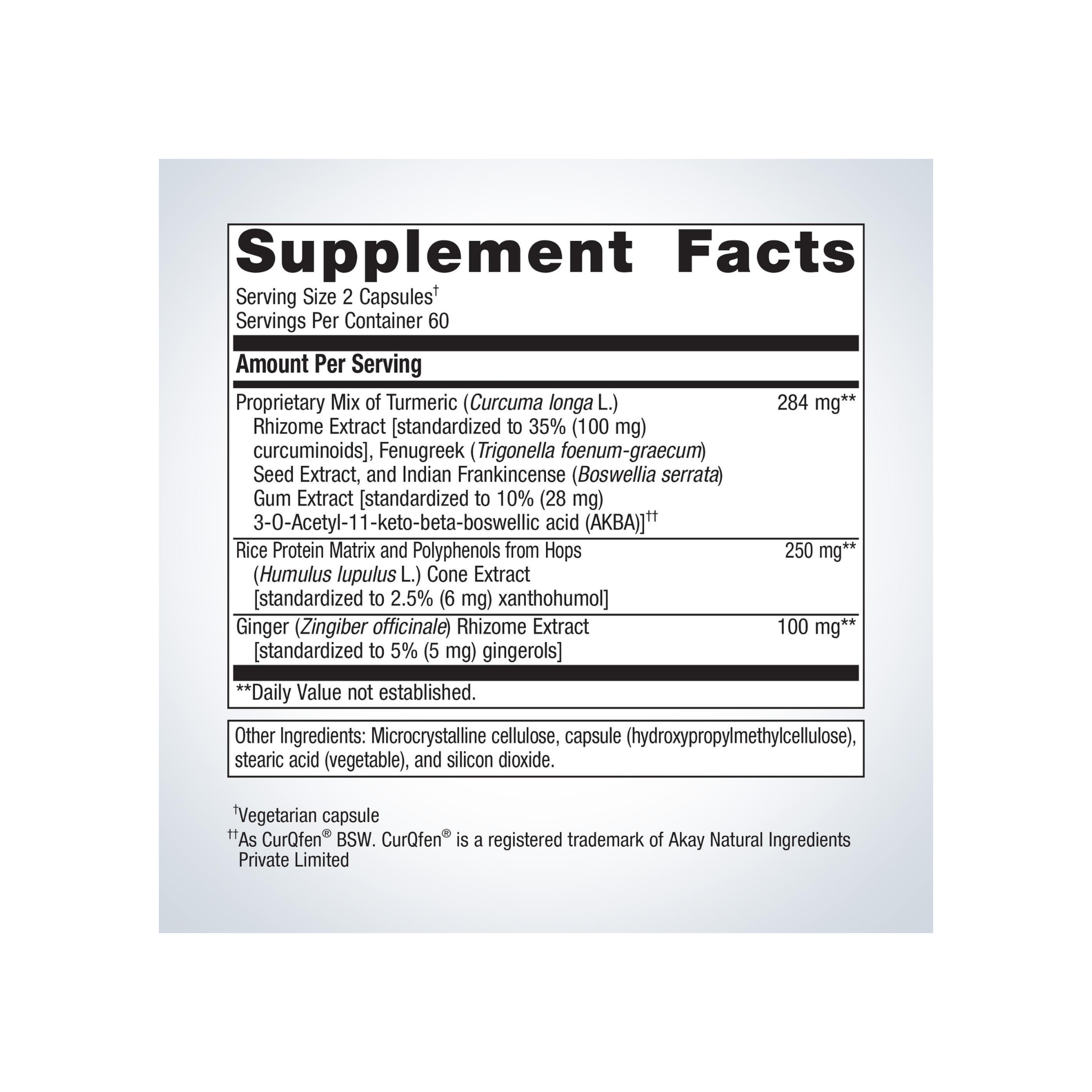 This targeted supplement supports a healthy inflammatory response with highly bioavailable CurQfen BSW (curcuminoids, AKBA, and fenugreek) and XNT ProMatrix xanthohumol. Ideal for adults managing joint discomfort or oxidative stress, it includes ginger extract for added immune support. Its vegetarian formula promotes comfort and mobility. Take 2 capsules daily with food, or as directed by a healthcare practitioner, to support joint health and reduce minor pain. Consult a physician if pregnant, nursing, or taking medications.