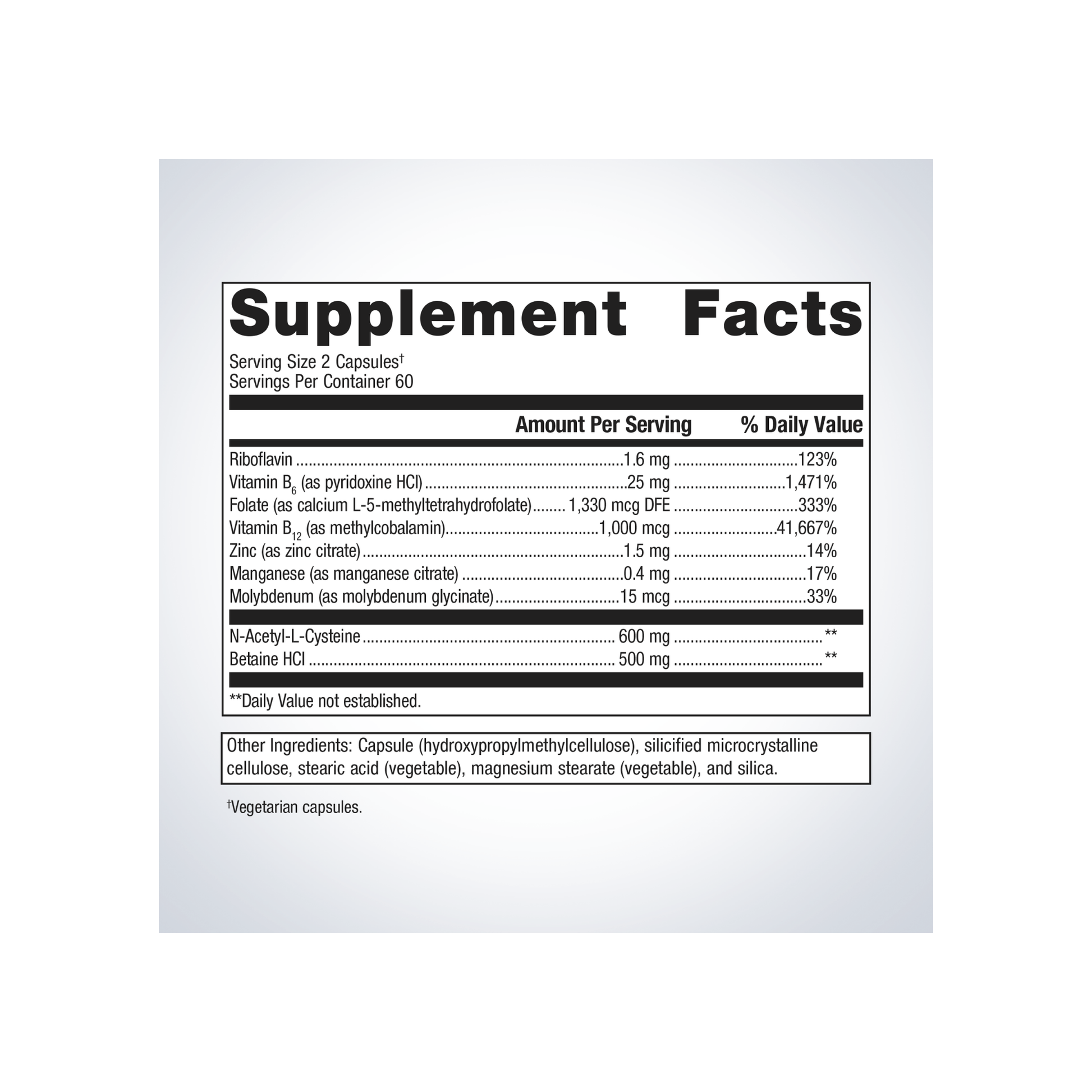 This comprehensive formula supports vascular health and methylation with L-5-methyltetrahydrofolate, methylated B12, and N-acetyl-L-cysteine. Ideal for adults managing homocysteine levels or cardiovascular function, it promotes energy production and amino acid metabolism in a vegetarian formula. Its nutrients enhance metabolic balance. Take 2 capsules daily, or as directed by a healthcare practitioner, to support heart and brain health. Consult a physician if pregnant, nursing, or taking medications.