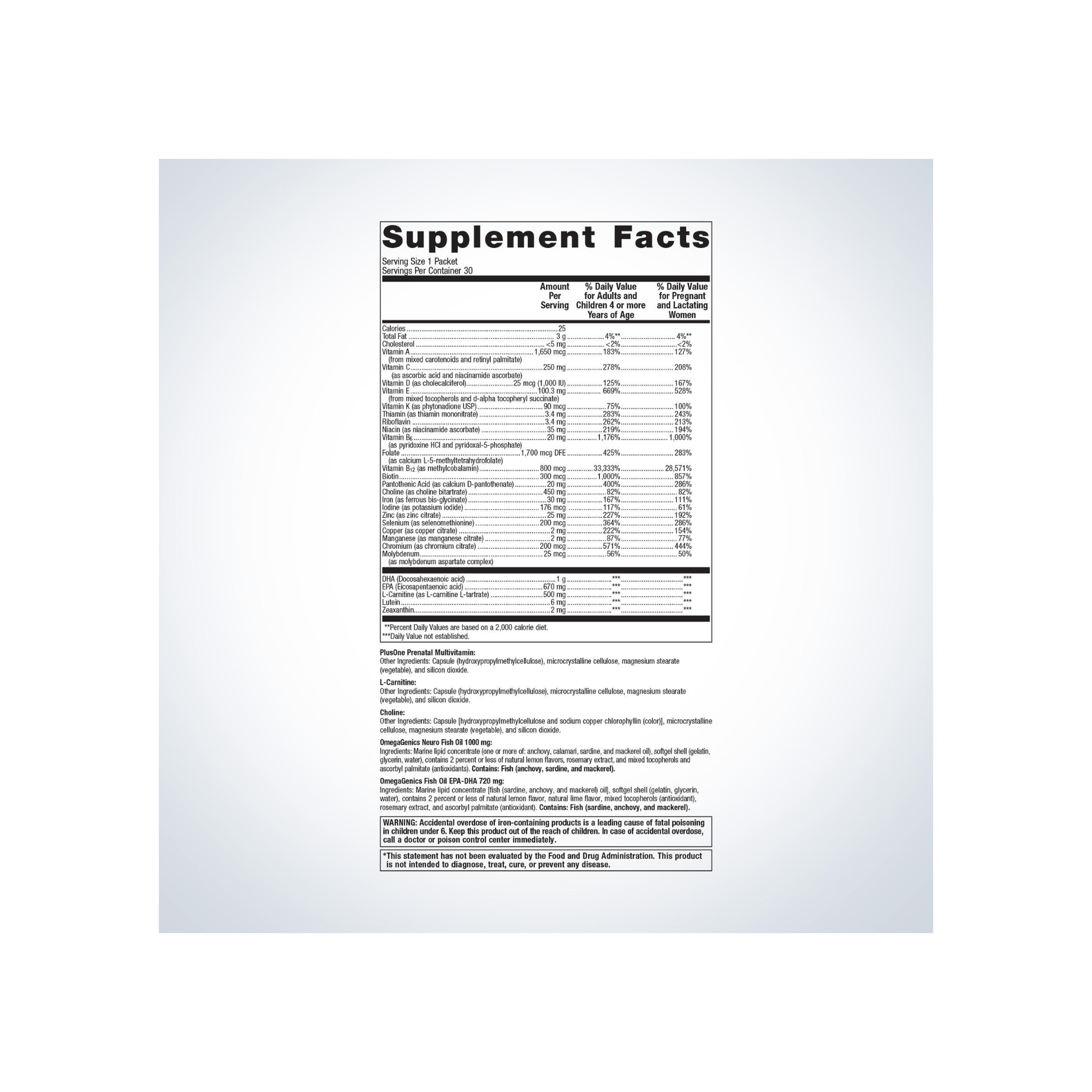 These prenatal packets provide essential vitamins, minerals, and omega-3s to support women from preconception through nursing. Suitable for expecting or nursing mothers, they promote maternal and fetal health with a science-based multivitamin, omega-3s for cognitive development, and choline. Take one packet daily with food, under healthcare professional guidance, for balanced prenatal nutrition.