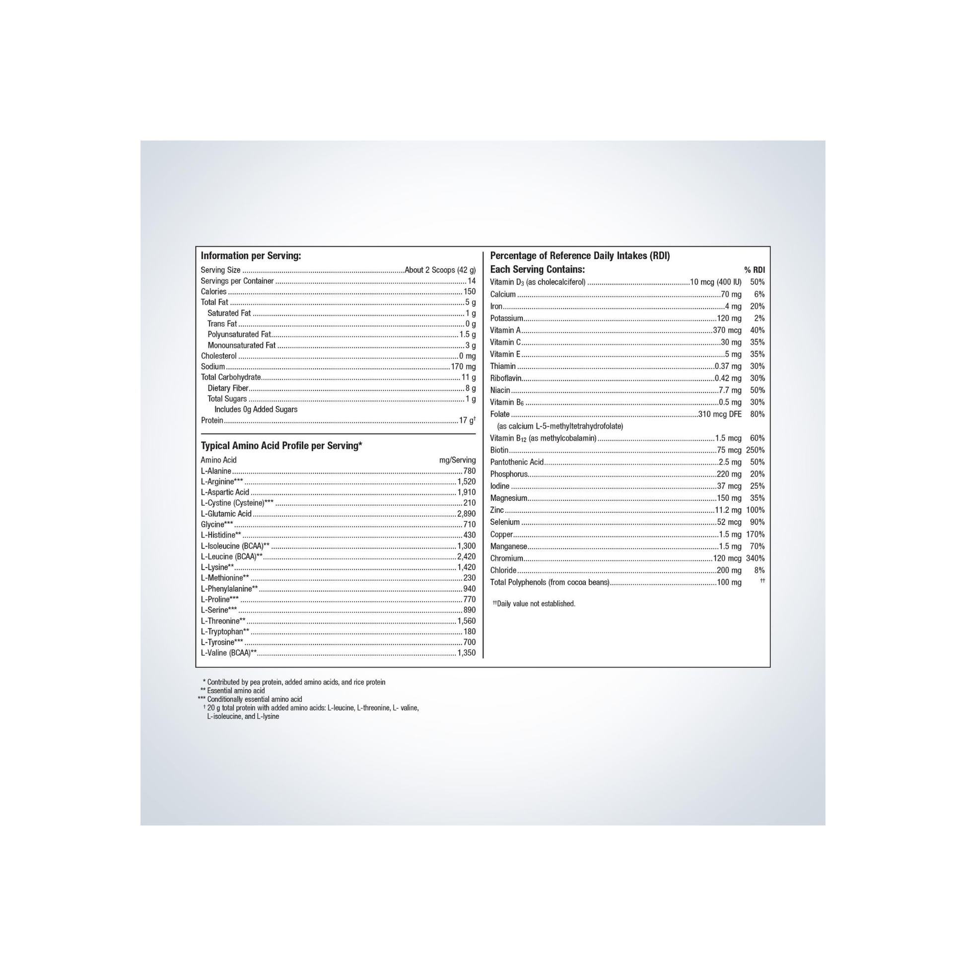 This medical food supports muscle maintenance in sarcopenia with 17 g of protein from a pea/rice blend and essential amino acids, promoting skeletal muscle health. Ideal for adults experiencing age-related muscle loss, it includes 25 vitamins and minerals to support protein synthesis and overall wellness. Its vegetarian formula ensures high potency and efficacy. Blend 2 scoops (42 g) into 8-10 oz of chilled water one to two times daily, or as directed by a healthcare practitioner, under medical supervision. Consult a physician if pregnant or nursing.
